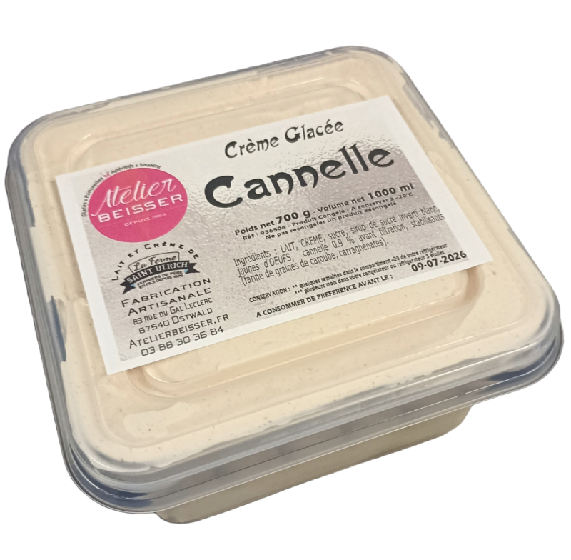 Ingrédients : LAIT, CREME, sucre, sirop de sucre inverti blanc, jaunes d’OEUFS, cannelle 0.9 % avant filtration, stabilisants (farine de graines de caroube, carraghénates).