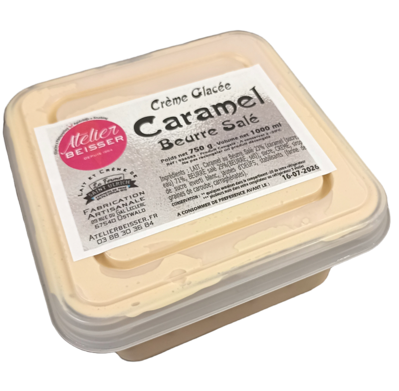 Ingrédients : LAIT, Caramel au Beurre Salé 23% (caramel (sucre, eau) 71%, BEURRE salé 29%(BEURRE, sel)), sucre, CREME, sirop de sucre inverti blanc, jaunes d’OEUFS, stabilisants (farine de graines de caroube, carraghénates).