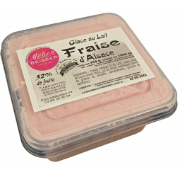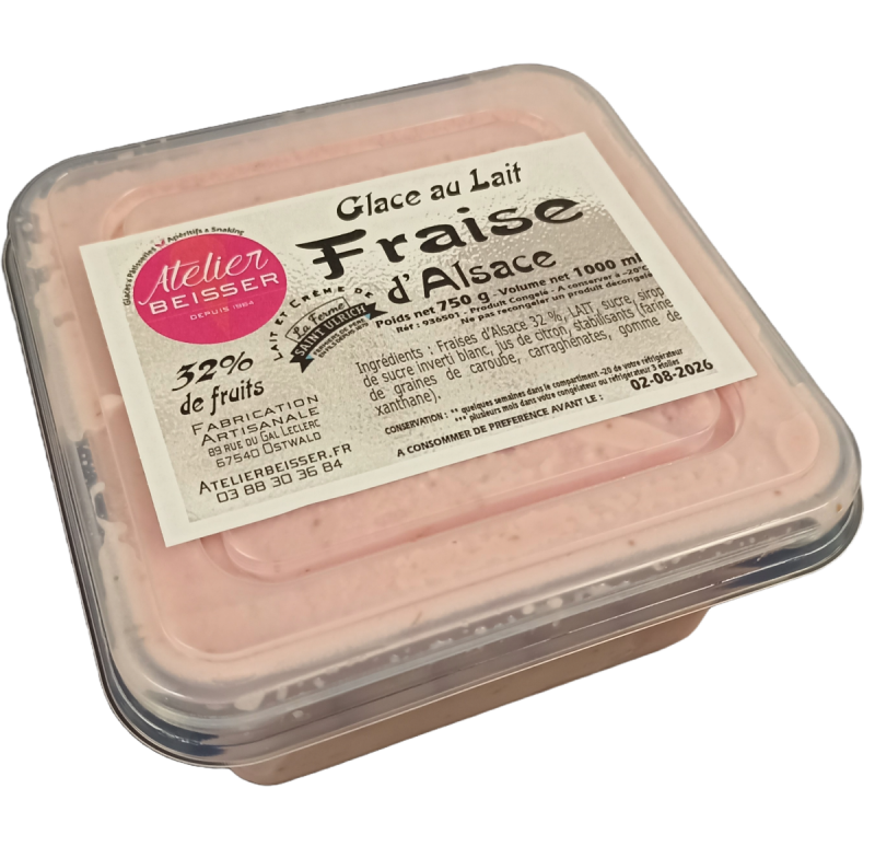 Ingrédients : Fraises d’Alsace 32 %, LAIT, sucre, sirop de sucre inverti blanc, jus de citron, stabilisants (farine de graines de caroube, carraghénates, gomme de xanthane).