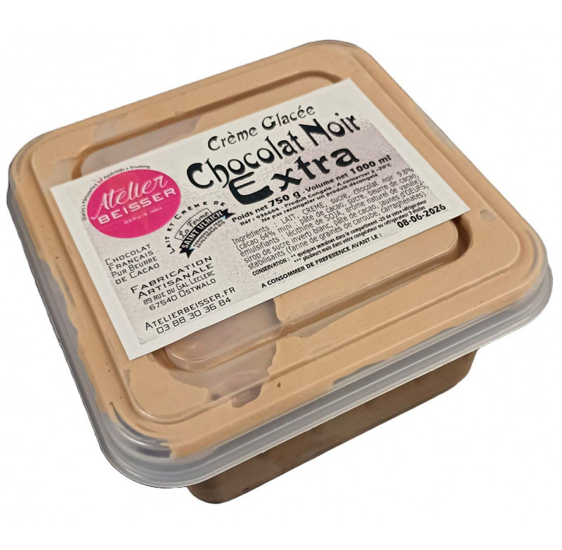 Ingrédients : LAIT, CREME, sucre, chocolat noir 9.8% (cacao 64% mini : pâte de cacao, sucre, beurre de cacao, émulsifiants : lécithine de SOJA, arôme naturel de vanille), sirop de sucre inverti blanc, pâte de cacao, jaunes d’OEUFS, stabilisants (farine de graines de caroube, carraghénates).