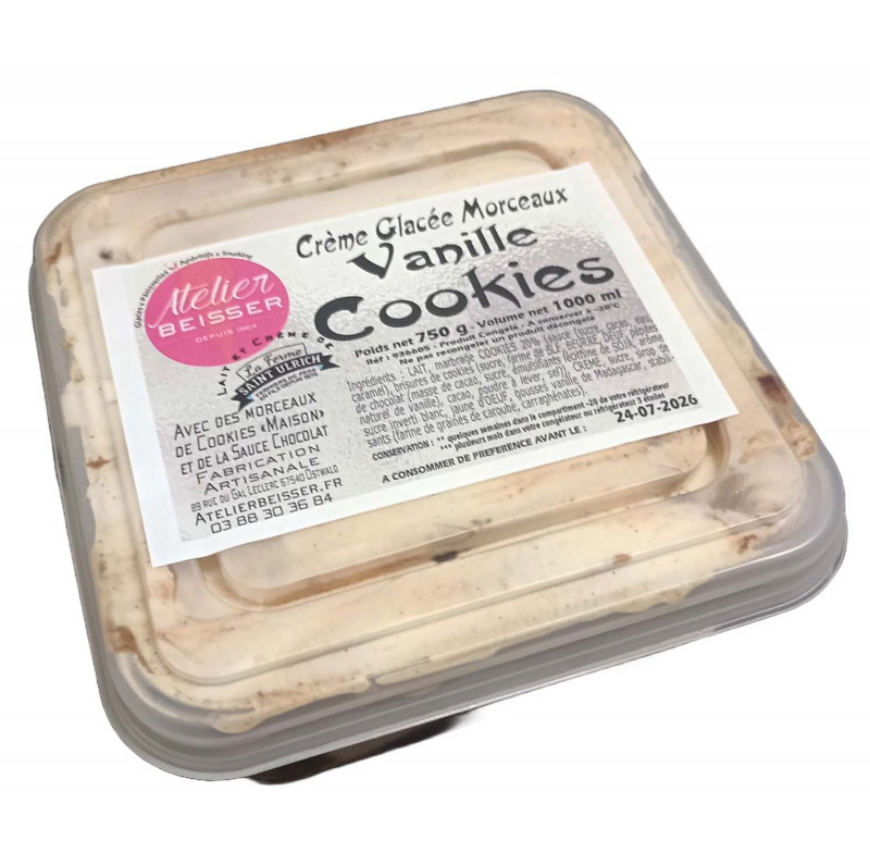 Ingrédients : LAIT, marbrage COOKIES 20% (sauce (sucre, cacao, eau, caramel), brisures de cookies (((sucre, BEURRE, farine de Blé, OEUFS, cacao, poudre à lever, sel), pépites de chocolat (masse de cacao, sucre, émulsifiants lécithine de SOJA, arôme naturel de vanille), BEURRE, cacao, eau), CREME, sucre, sirop de sucre inverti blanc, jaune d’OEUF, arôme vanille avec gousses épuisées & broyées, stabilisants (farine de graines de caroube, carraghénates).