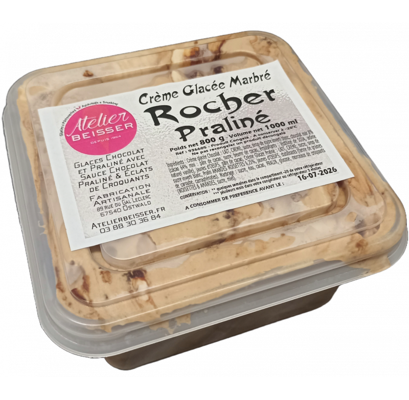 Ingrédients : Crème glacée Chocolat : LAIT, CREME, sucre, sirop de sucre inverti blanc, chocolat noir 8% (cacao 64% mini : pâte de cacao, sucre, beurre de cacao, émulsifiants : lécithine de SOJA, arôme naturel vanille), jaunes d’OEUFS, pâte de cacao, Crème Glacée Praliné : LAIT, CREME, sucre, sirop de sucre inverti blanc, Pralin AMANDES NOISETTES & pâte de NOISETTES du Piémont 6,25%, jaunes d’OEUFS, stabilisants (farine de graines de caroube, carraghénates). Marbrage : sucre, eau, cacao, PRALIN, glucose, morceaux de croquants (NOISETTES & AMANDES, sucre, miel).