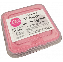 Ingrédients : purée de Pêche de Vigne 50%, eau, sucre, sirop de sucre inverti blanc, glucose, stabilisants (farine de graines de caroube, farine de guar).