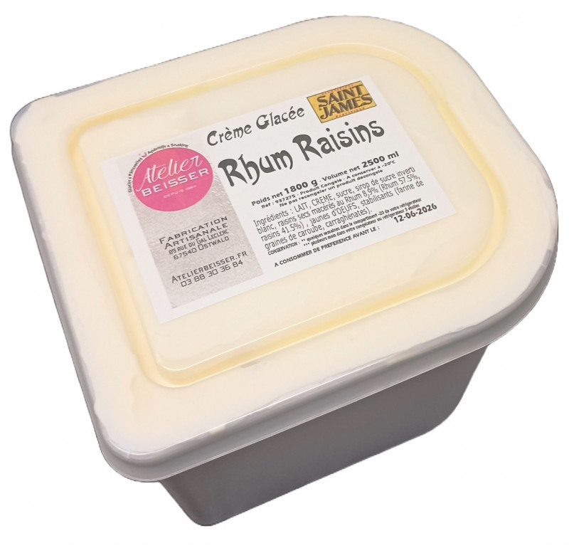 Ingrédients : LAIT, CREME, sucre, sirop de sucre inverti blanc, raisins secs macérés au Rhum 8,9% (Rhum 57.5%, raisins 41.5%) , jaunes d’OEUFS, stabilisants (farine de graines de caroube, carraghénates).