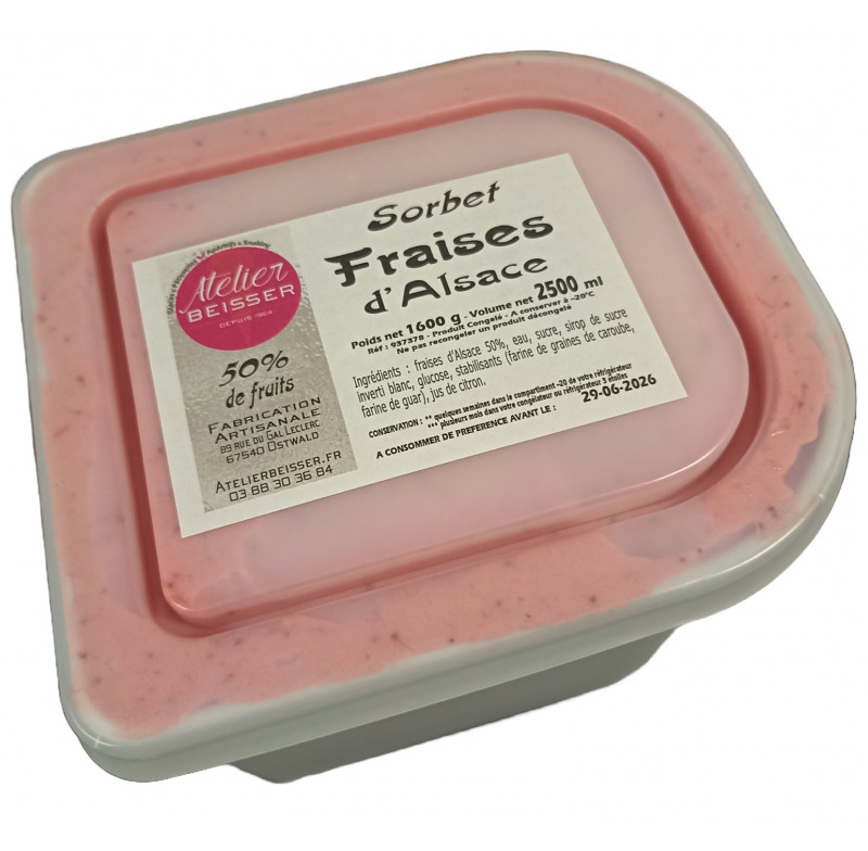 Ingrédients : Fraise d'Alsace 50%, eau, sucre, sirop de sucre inverti blanc, glucose, stabilisants (farine de graines de caroube, farine de guar), jus de citron.