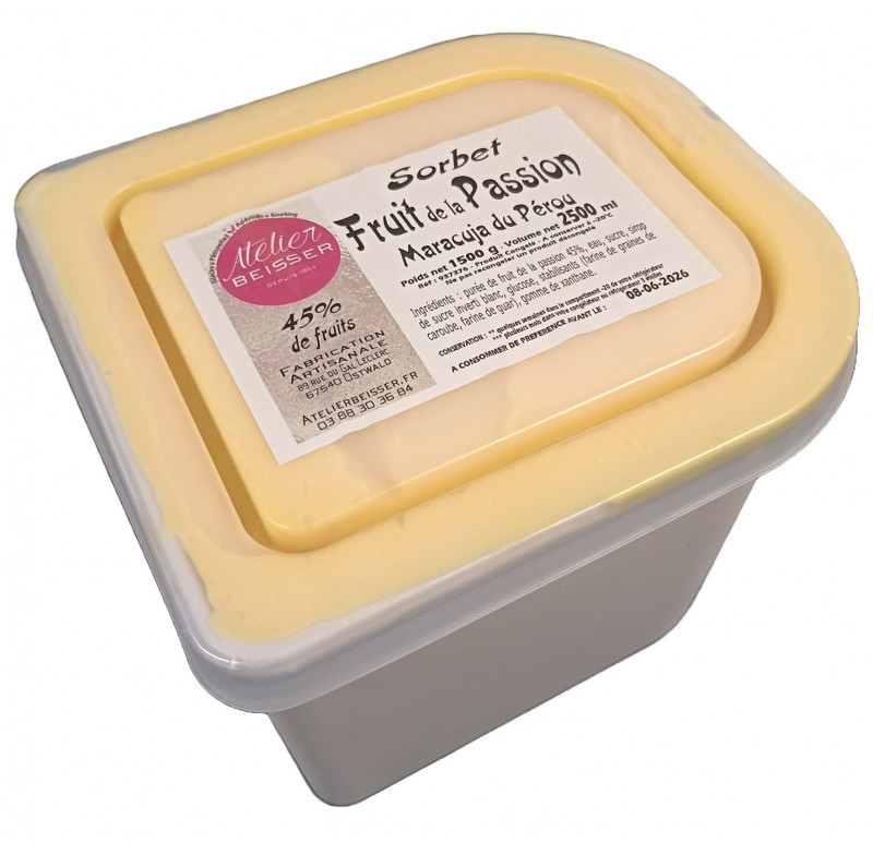 Ingrédients : purée de fruit de la passion 45%, eau, sucre, sirop de sucre inverti blanc, glucose, stabilisants (farine de graines de caroube, farine de guar, gomme de xanthane).
