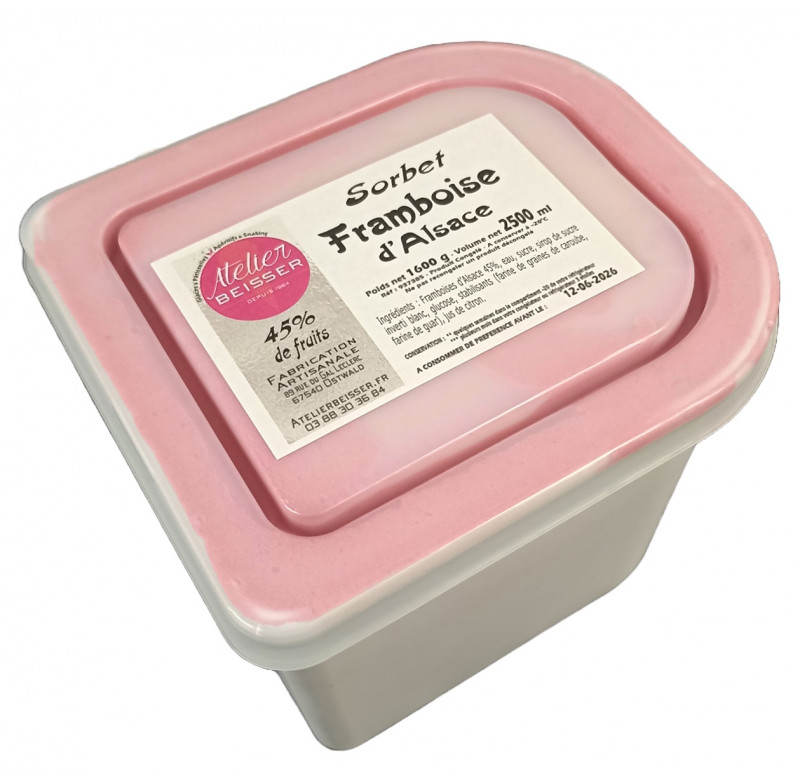 Ingrédients : purée de Framboise 45%, eau, sucre, sirop de sucre inverti blanc, glucose, stabilisants (farine de graines de caroube, farine de guar), jus de citron.