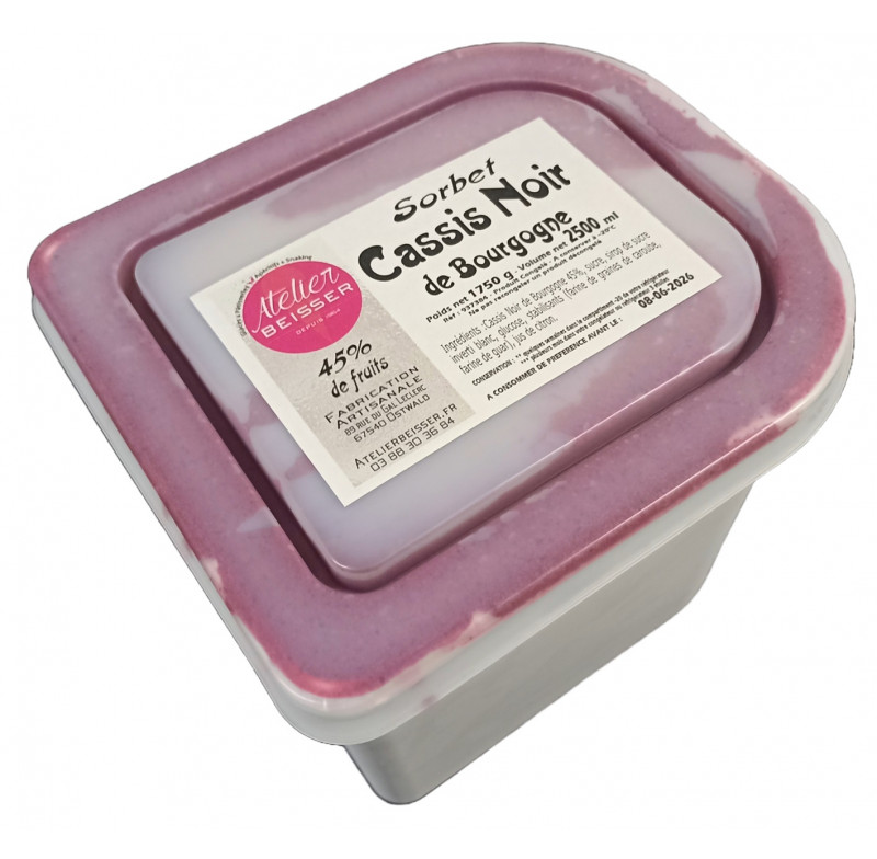 INGREDIENTS : Cassis Noir de Bourgogne 45%, eau, sucre, sirop de sucre inverti blanc, glucose, stabilisants végétaux naturels (farine de graines de caroube, farine de guar), jus de citron.