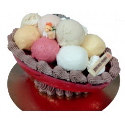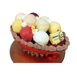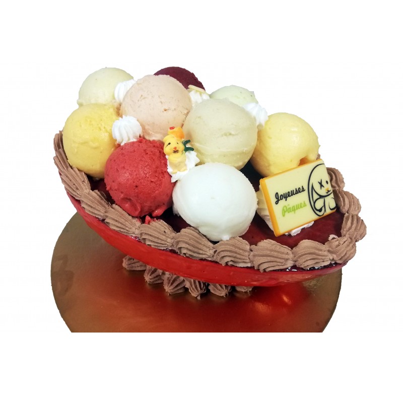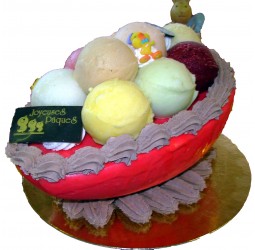 Ingrédients : Sorbet Framboise : purée de fruits 45%, eau, sucre, sirop de sucre inverti blanc, jus de citron, glucose, stabilisants (farine de graines de caroube, farine de guar). Sorbet Passion : purée de fruits 45%, eau, sucre, sirop de sucre inverti blanc, glucose, stabilisants (farine de graines de caroube, farine de guar, gomme de xanthane). Boules en sorbets : eau, sucre, sirop de sucre inverti, purée de banane (55% du sorbet), purée de poire (55% du sorbet), jus d’orange (55% du sorbet), purée de cassis (50% du sorbet), purée d’abricots (50% du sorbet), purée de pomme verte (50% du sorbet), purée de pêche (50% du sorbet), purée de fraise (45% du sorbet), jus de citron, stabilisants ( farine de graines de caroube, farine de guar, carraghénates), glucose. DÉCOR : CREME, sucre, cacao, plaquettes chocolats, sujets en plastique non consommable.