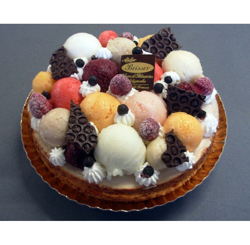 Ingrédients : base sorbet : purée de fruits 45% minimum, eau, sucre, sirop de sucre inverti blanc, glucose, stabilisants : (farine de graines de caroube, farine de guar), jus de citron. Boules de sorbets : eau, sucre, sirop de sucre inverti, purée de pomme verte (50% du sorbet),purée de poire (55% du sorbet), purée de pêche jaune (45% du sorbet), purée de banane (45% du sorbet), purée de fraise (45% du sorbet), purée de cassis (50% du sorbet), jus d’orange (55% du sorbet), purée d’abricot (50% du sorbet), jus et purée de citron (27% du sorbet), stabilisants (farine de grainesde caroube, farine de guar), glucose. Biscuit décor : sucre, farine de BLE, blancs d’ŒUFS(dont épaississants E412), jaunes d’ŒUFS, poudre d’AMANDES, sel, arôme naturel de vanille, décor sérigraphie : cacao, amidon de maïs, colorants E171-E120-E172, sucre, blanc d’ŒUFS déshydraté. Décor : CREME, sucre, pâte à glacer foncée (sucre, matière grasse végétale totalement hydrogénée (noix de coco, palmiste) en proportion variable, poudre de cacao maigre, sucre du LAIT, émulsifiants : lécithine de SOJA, arôme, vanilline), framboises, groseilles.