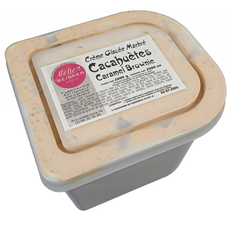Ingrédients : LAIT, Caramel au Beurre Salé 23% (caramel (sucre, eau) 71%, BEURRE salé 29%(BEURRE, sel)), sucre, Croquant cacahuète (sucre 50%, CACAHUETE 33%, miel 17%), CREME, sirop de sucre inverti blanc, Brownie ((sucre, farine de BLE, cacao en poudre, sel, arôme), ŒUFS, BEURRE, chocolat noir (cacao 64% mini : pâte de cacao, sucre, beurre de cacao, émulsifiants : lécithine de SOJA, arôme naturel de vanille)), jaunes d’OEUFS, stabilisants (farine de graines de caroube, carraghénates).