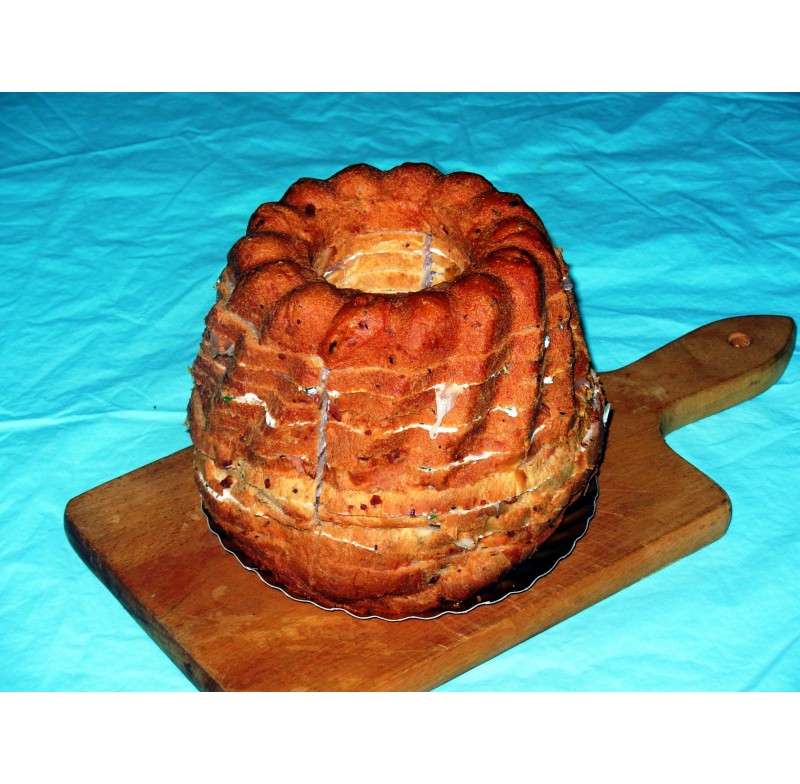 Ingrédients : Kouglof : farine de BLE, LAIT, OEUFS, BEURRE, NOIX 7%, levure, sucre, sel, améliorants (farine de FROMENT étuvée, farine de BLE malté, émulsifiants E 472, lécithine de SOJA, acide ascorbique, alpha amylases, hémicellulases). Fourrage : jambon fumé foret noire (jambon de porc, sel iodé, épices, sucre, conservateurs e 250 e 252, fumée) 13% du kouglof farci, fromage blanc aux fines herbes (FROMAGE BLANC (LAIT)à 40% M.G. , sel, ail, persil, ciboulette, échalotes, cerfeuil, poivre).