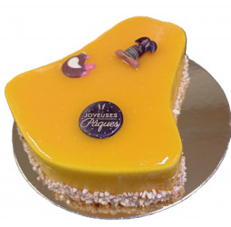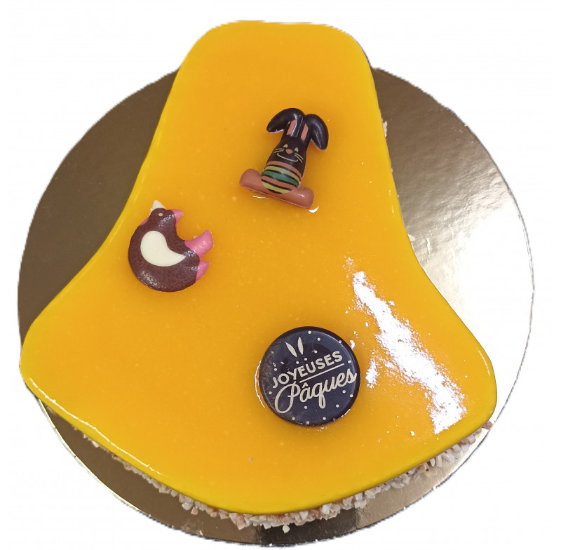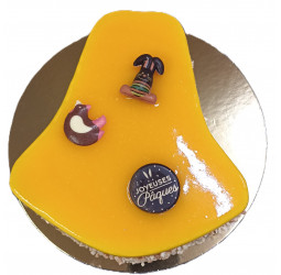 Ingrédients : Mousse Fruit de la Passion : CREME, purée (jus) de fruit de la Passion, sucre, LAIT, gélatine bovine . Crémeux Framboise : CREME, framboise, confiture de framboise Linzer, sucre, gélatine bovine. Biscuit Nature : sucre, farine de BLE, ŒUFS, farine de maïs. Décor : glaçage tendre (eau, sucre, chocolat blanc, gélatine bovine, farine de maïs, glucose), praligrains (sucre, AMANDES), plaquette chocolat. ELEMENTS EN PLASTIQUES NON CONSOMMABLES.